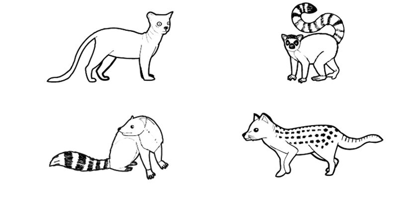 Si algún día vas a Madagascar, podrás ver estos animales. Pregunta a tus padres y buscad en internet. Así podrás pintarlos con los colores que les corresponde a cada uno. Además, escribe debajo su nombre y así los reconcerás más facilmente: fosa, ringtail, mangosta, makicatta.