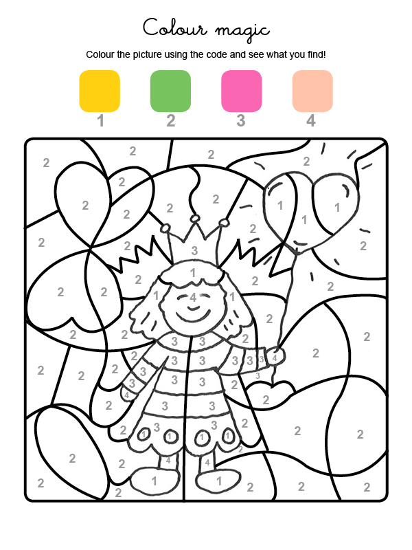 Te proponemos un dibujo mágico en inglés de una princesa para el día de la madrepara los niños que quierenaprender inglés. Pincha en el botón imprimir para verlo en grande. ¿Has adivinado ya cómo es? Es muy fácil, sólo tienes que colorear con los colores indicados para cada número y descubrirás lo que se esconde detrás de ellos. Además aprenderás los números y los colores en inglés de forma muy fácil.