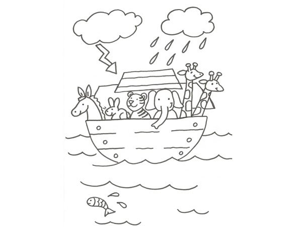 Simpática escena bíblica donde aparece el gigantesco Arca de Noé con todas las parejas de animales que el mítico personaje salvó del diluvio universal. Imprímela gratis para colorear con tus hijos.