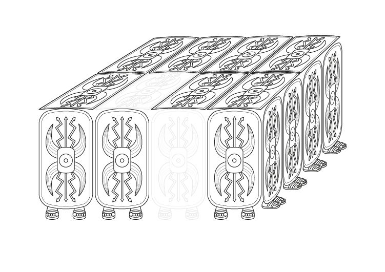 Ésta es una tortuga romana, una táctica utilizada por las legiones romanas.Los soldados formaban un caparazón con sus escudos para protegerse de flechas y lanzas. Coloréala, pero antes dibuja los escudos que faltan para que la tortuga sea perfecta.
