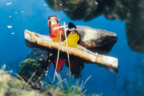 5. Cuando pones los indios en la canoa tienes que llevar cuidado para repartir bien el peso y que la canoa no se vuelque. Cuando ya has encontrado la buena posición, pega los indios a la canoa. Ya sólo te queda poner la canoa en el agua para que los indios emprendan su viaje.