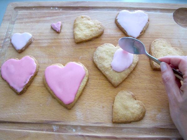 7. Pon una hoja de papel vegetal en la bandeja del horno. Pon los corazones sobre la place y hornea durante unos 8 minutos. Las galletas tienen que quedar un poco doradas. Mezcla en un cuenco el azúcar glass, la clara del huevo y el zumo de limón.