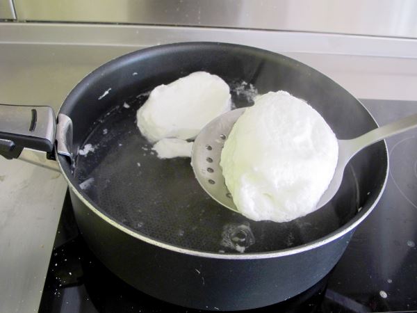 8. Hierve un litro de agua y baja el fuego. Deposita dentro grandes cucharadas de claras a punto de nieve. Escalfa las bolas durante 2 o 3 minutos dando la vuelta con una espumadera. Después, deposítalas sobre un paño limpio.