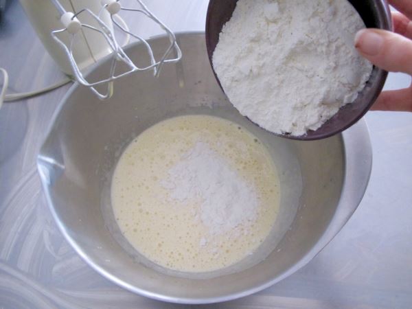 2. En una fuente, mezcla los huevos y el azúcar y bate hasta conseguir una mezcla ligera y espumosa.