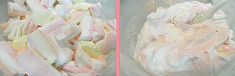 1- Para preparar el fondant, hay que untar un bol de mantequilla y colocar una gran cantidad de nubes de golosinas con 3-4 porciones de mantequilla. Meter al microondas unos 2-3 minutos aproximadamente.