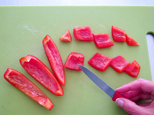 14. Córtalo en tiras y luego en trocitos más pequeños.