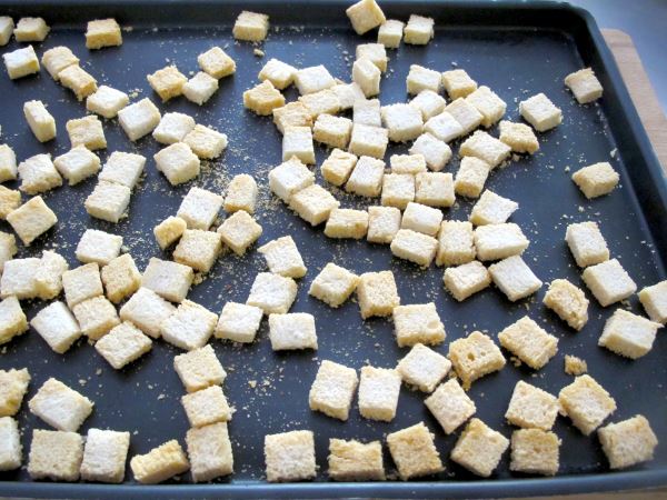 4. Pon papel de hornear en una bandeja de horno, echa encima los cubos de pan de molde y hornea durante unos 15 minutos hasta que se doren.