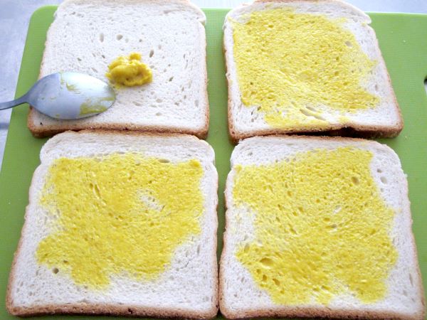 2. Unta la mostaza sobre cuatro rebanadas de pan de molde.