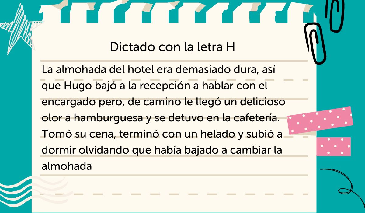 Si buscas dictados con la letra H para niños , echa un vistazo a esta selección de dictados cortos y largos con palabras que comienzan o contienen esta letra. Y además, te invitamos a realizar una serie de dictados con H intercalada.