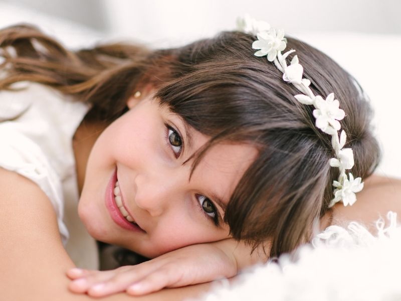 Si no quieres asumir el gasto de peluquería para tu hija, puedes comprar una bonita diadema de flores como esta. A continuación, realiza un semirecogido y coloca la diadema bien anclada con horquillas para que le dure todo el día.