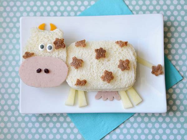 Pan de molde (la corteza sirve para hacer las manchas), jamón, queso, cheddar para los cuernos, ojos hechos con trozos de huevo duro y aceitunas, y pasas para la nariz… ¡muy buenas, señora vaca!