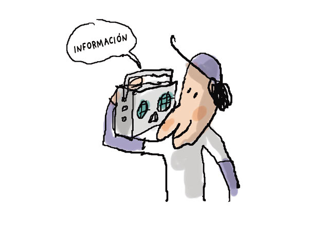 Está la radio, en la que la información de transmite a través de palabras y sonidos.