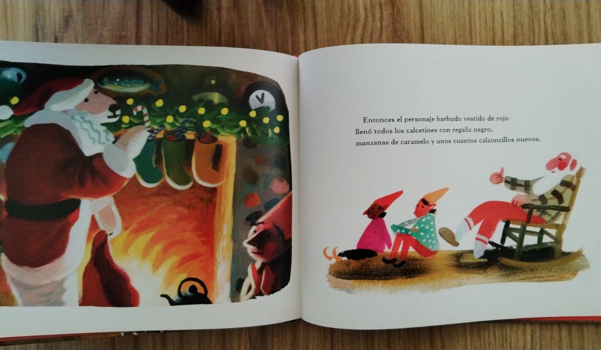 El texto es sencillo, fácil de leer, para que toda la familia pueda disfrutar de la historia. Está pensado para primeros lectores, o para leer a los niños antes de acostarse, especialmente si queremos meterles ese gusanillo en el cuerpo que supone la llegada de Papá Noel. Y, si ya lo hacemos sentados en un sofá frente a una chimenea y una taza de chocolate caliente ¡no hay habrá manera de borrar ese recuerdo de nuestras cabezas!
