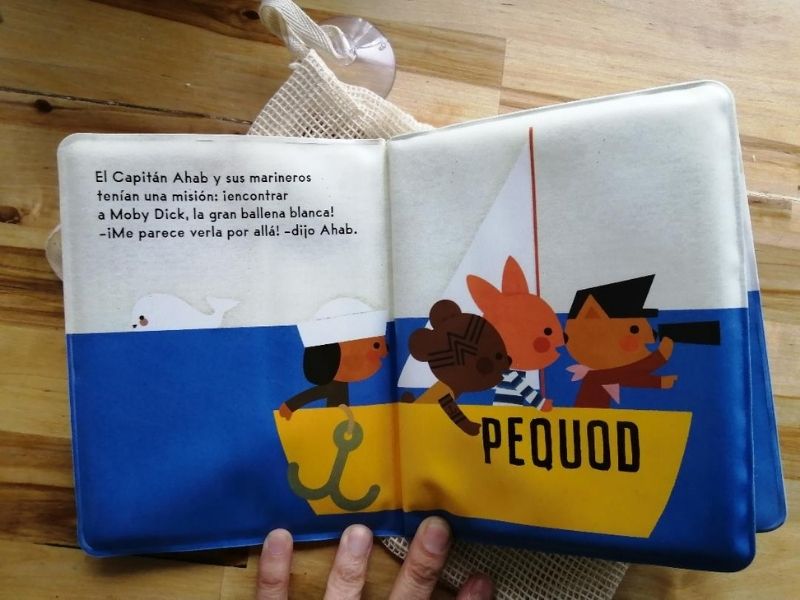 Además, una vez que ya hayamos leído el cuento y hayan desaparecido las burbujas de la bañera, podemos dejar el libro en la bolsa de tela con ventosas que viene con él, bien pegadito a las paredes del baño, para tenerlo siempre a mano cuando queramos navegar por la literatura de nuevo.