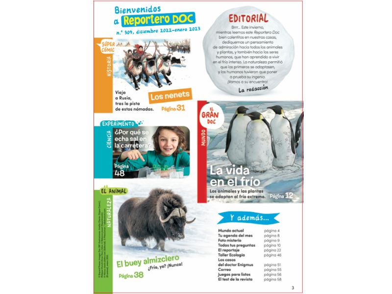 Brrr... Este invierno, mientras leemos este Reportero Docde diciembre 2022 bien calentitos en nuestras casas, dediquemos un pensamiento de admiración hacia todos los animales y plantas, y también hacia los seres humanos, que han aprendido a vivir en el frío intenso. La naturaleza permitió que los primeros se adaptasen, y los humanos tuvieron que poner a prueba su ingenio.