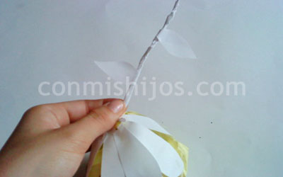 4. Recorta tiritas de papel y enróllalas sobre sí mismas retorciéndolas, para formar una especie de ramita. Pega hojitas en la rama de papel. Pega la rama a la bola.