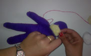 Cose las 2 partes de la muñeca cruzando los puntos, como en la foto. Deja un trozo sin coser. Utiliza ese agujero para rellenar la muñeca con algodón y termina de coserla.