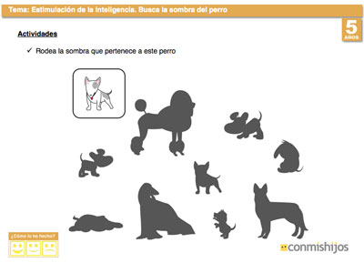 Este es un ejercicio para potenciar la percepción visual y la atención en los niño de 5 años. Actividades de estimulación de la inteligencia en niños en el que tendrán que encontrar la sombra del perro que es igual al modelo.