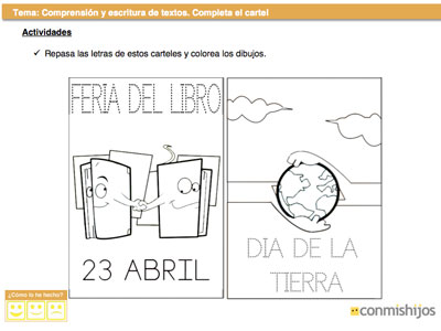 Este ejercicio de lectoescritura está dirigido a niños de 5 años y pretende iniciar al niño en la escritura. Esta actividad está dirigida a que los niños reconozcan los elementos que componen un cartel.