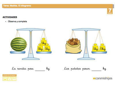 ¿Cuánto pesa una sandía? ¿Y un saco de patatas? En esta ficha escolar encontrarás ejercicios sobre el peso de los objetos para que los niños sepan cuánto es un kilogramo.
