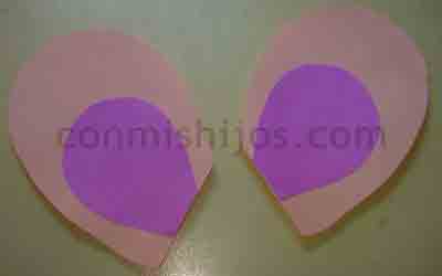 3. Pega los dos círculos rosas pequeños en el interior de las orejas. Dobla las dos puntas superiores de la bolsa y grapa encima las dos orejas.